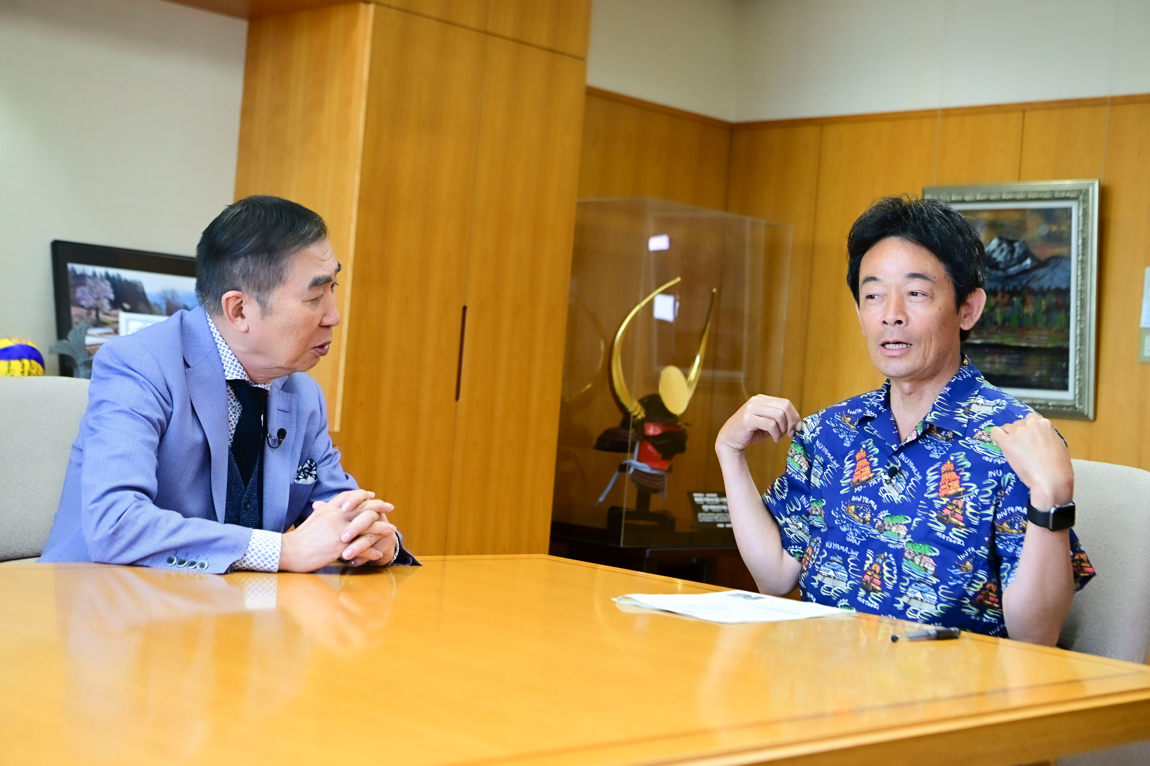番組後半では、原欣伸市長の市長室を伺い、犬山市の魅力を聞いていきます。1635年から行われ、ユネスコの無形文化財にもなっている「犬山市祭り」の話では、祭りの主役である“からくり人形”について詳しく聞きだし、市長室でからくり人形の実演も行われました。