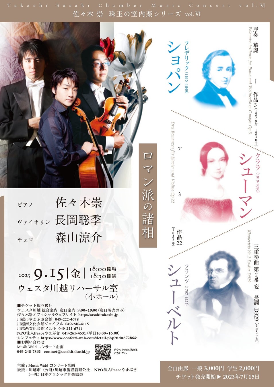 Musik Wald コンサート企画主催、『佐々木崇珠玉の室内楽コンサートvol.6~ロマン派の諸相~』が2023年9月15日 (金)にウェスタ川越リハーサル室(小ホール)(埼玉県川越市新宿町1-17-17)にて開催されます。