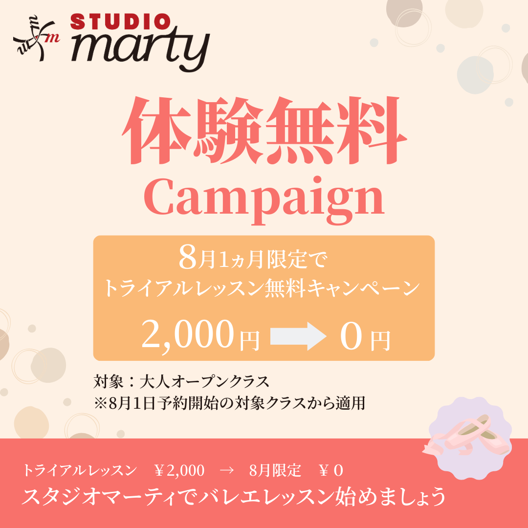あなたがバレエをスタジオマーティでは、とても楽しいバレエを、皆様にもっと楽しんでほしいという願いから、8月の1か月限定でトライアルレッスン無料キャンペーンを開催することとなりました!通常、トライアルレッスンは一回¥2,000のところ、来月8月の間は無料でバレエのレッスンを受けることができます。バレエには少し敷居が高いように感じることもあると思いますが、無料の期間は気兼ねなく始められるチャンスです。バレエの魅力に触れてみませんか。