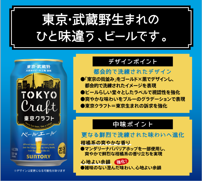 中味は、マンダリーナババリアホップ⼀部使⽤による柑橘系の爽やかな香りが特長です。パッケージは、爽やかな味わいを⻘⾊のグラデーションで表現しました。また、東京の街並みを⾦⾊と⿊⾊の組み合わせで、都会的で洗練されたデザインにしています。