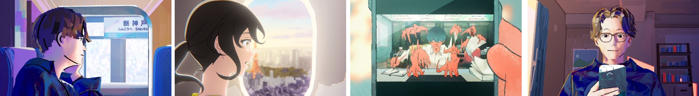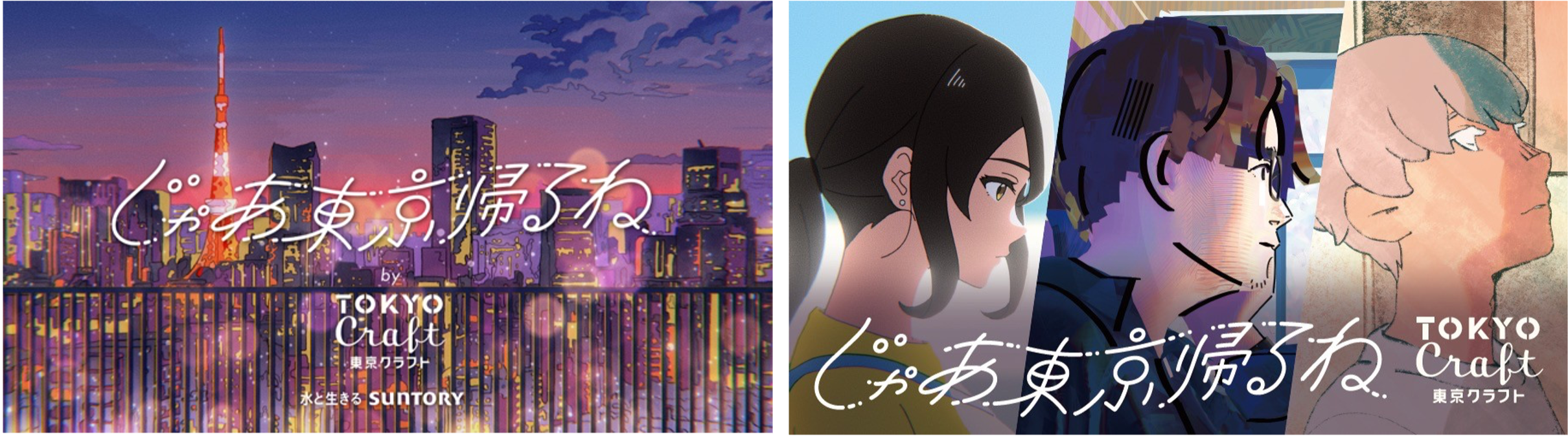 「じゃあ東京帰るね by 東京クラフト」では、映像作家の崎村宙央さんを中⼼に、しめさばさん、めいにーさん、ほ〜こうさん、けろさん、APO+さん、⻑江春芳さん、fussoさん、総勢8名のクリエイターが動画の制作を⼿掛け、上京をテーマに故郷から東京までの帰り道で心が揺れ動く3⼈の若者の様⼦を描きました。3⼈の登場⼈物は、⼈気声優の三上枝織さん、岩崎諒太さん、⾚⽻根健治さんが演じ、「東京帰るね」と⾔ってしまった⾃分に違和感を覚えつつも、⼤切な故郷の⾵景や思い出を思い出しながら、東京での⽣活を頑張って行く様⼦を表現したアニメーション作品です。