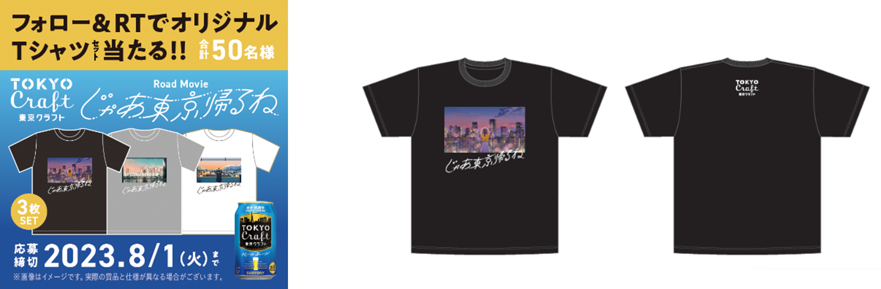 サントリー公式Twitterアカウント(@suntory)をフォローし、キャンペーンツイートをリツイートした⽅から抽選で50名様にオリジナルデザイン「じゃあ東京帰るね」Tシャツをプレゼント。