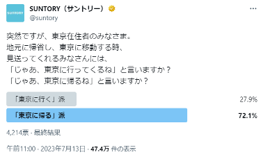 「東京に⾏く」派27.9%、「東京に帰る」派72.1%と