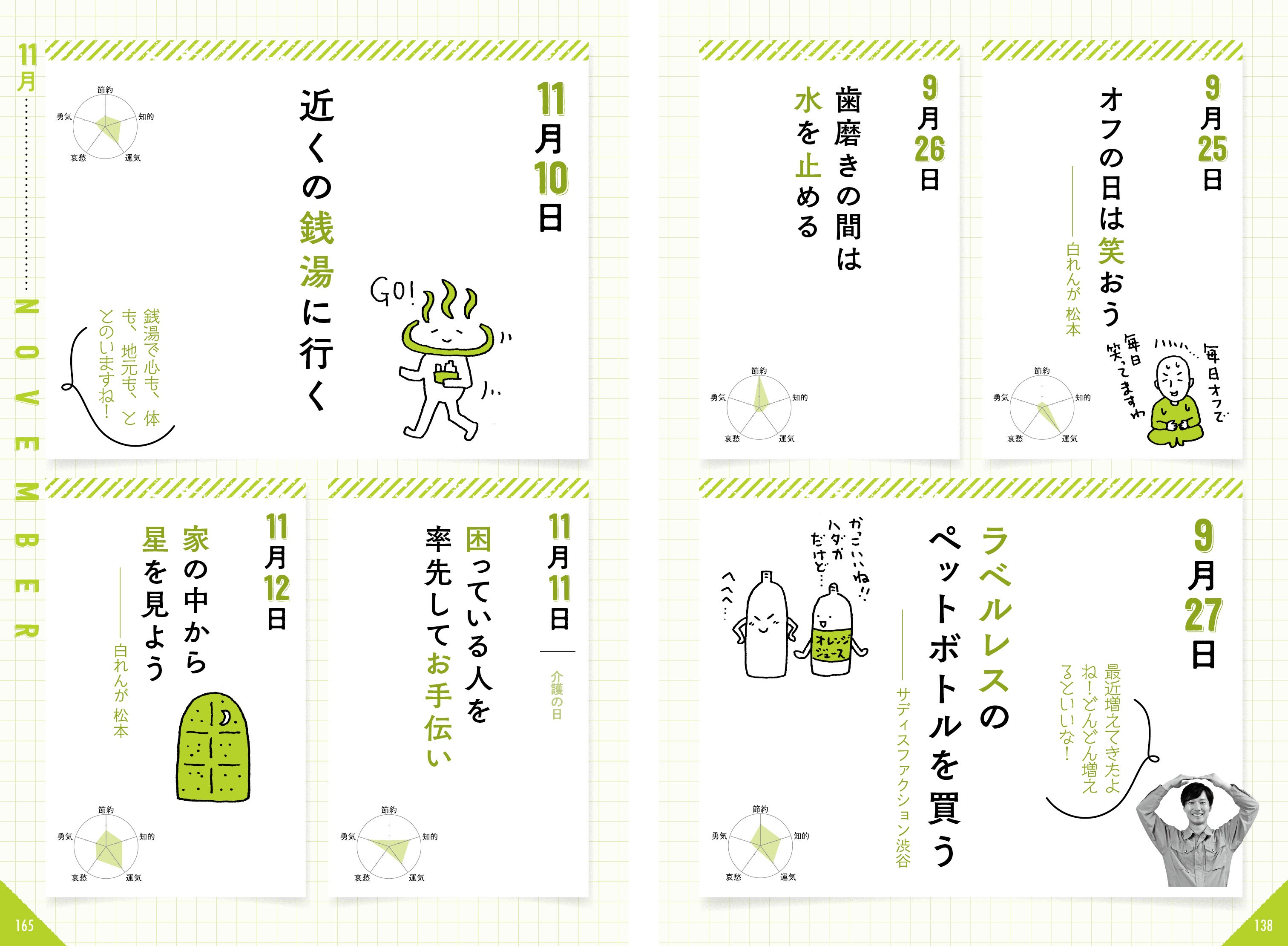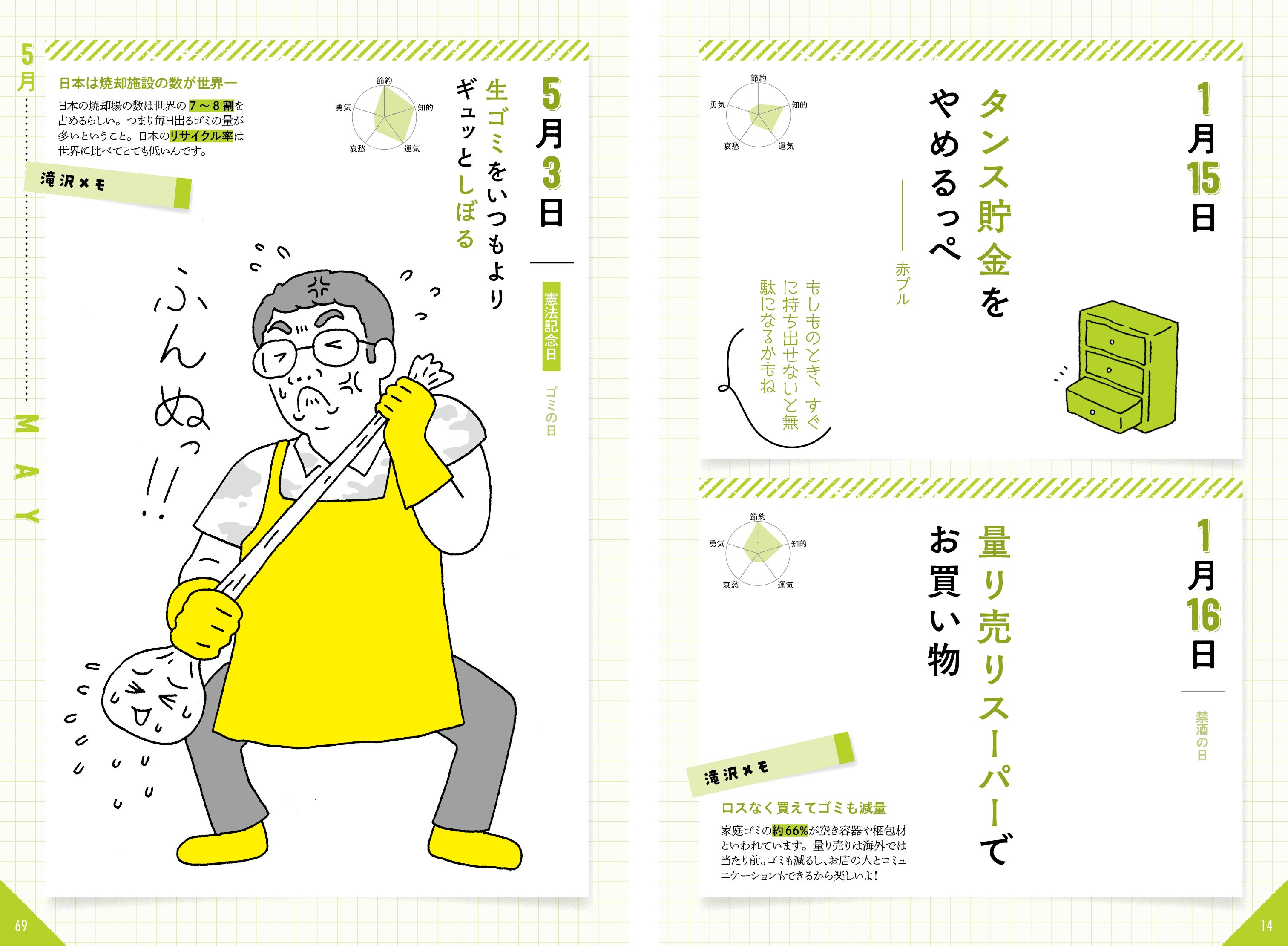 かわいいイラストと滝沢メモが誌面を賑やかにしてくれます。難しい内容はいっさいナシ。好きな日に、ふとしたときに、めくったページのアクションにチャレンジ。 SGDsは我慢することではなく、一日一日を丁寧に過ごすこと。身近な日常からSDGsのヒントを探してみる一冊。
