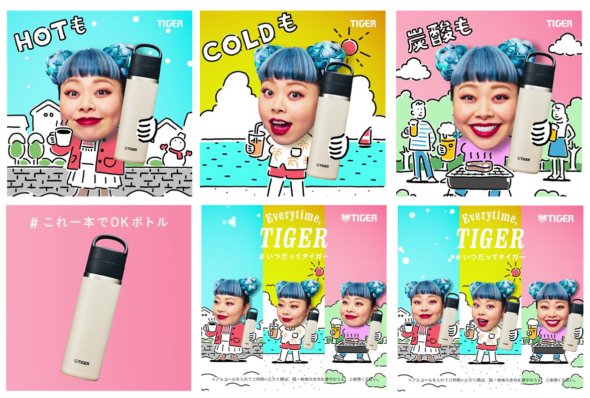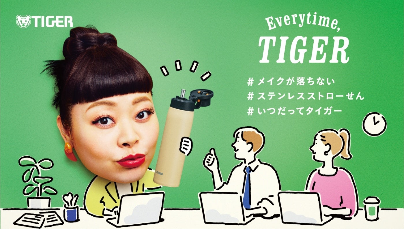 新ビジュアルでは、渡辺直美さんがイラストの世界に入り、「Everytime,TIGER(いつだってタイガー)」というキャッチフレーズにふさわしく、日常の様々なシーンでタイガーボトルを使っている様子を、豊かな表情で演じていただきました。ご自身のSNSで素敵な色使いの服装をお召しになっている姿が印象的で、ファッショナブルな渡辺直美さんらしく、タイガーボトルの多様なデザインやカラーラインアップ、そして機能性を表現しています。