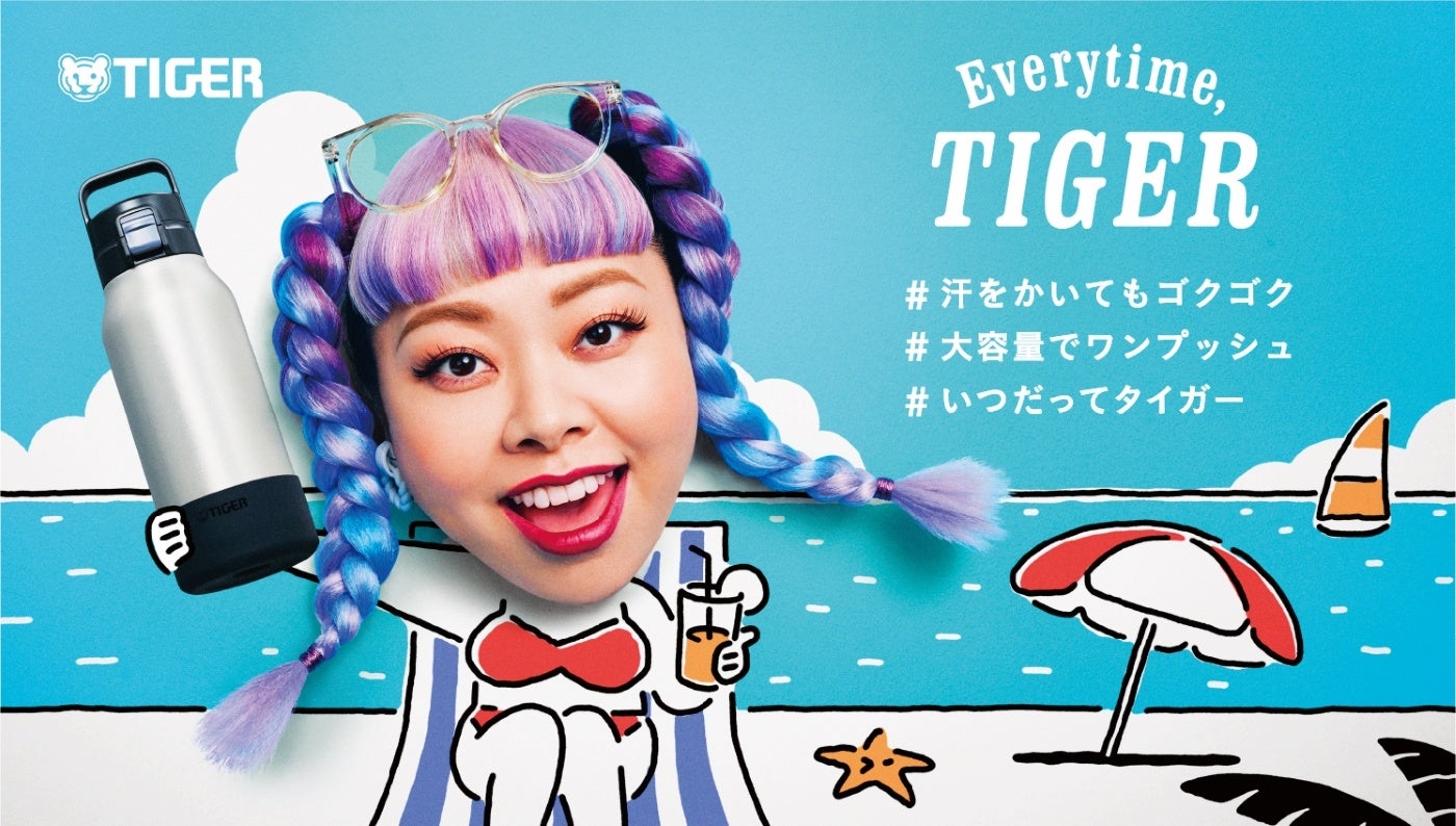 今回はより多くの方に様々なシーンでボトルを楽しんでいただくために、2023年4月よりブランドパートナーとして迎えた渡辺直美さんに、新たにボトルアンバサダーにも就任いただきました。全4パターンある新ビジュアルでは、イラストの世界に入った渡辺直美さんが、「Everytime,TIGER(いつだってタイガー)」を体現するように、日常の様々なシーンでタイガーボトルを使っている様子を表現しています。また、新WebCMは、新ビジュアルに合わせたポップな作品となっています。家やオフィス、ビーチと様々なシチュエーションでボトルを楽しむ渡辺直美さんのコミカルな演技と共に、タイガーボトルの利便性の高さを発信しています。新ビジュアルならびに新WebCMは、タイガー魔法瓶公式SNS、取扱店舗、広告など、各種媒体でも順次公開いたします。