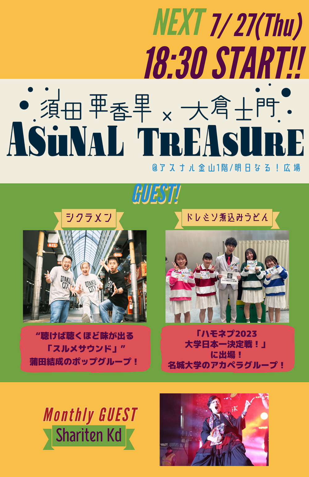 ゲストは、聴けば聴くほど味が出る「スルメサウンド」でお馴染みのポップグループ「シクラメン」。「ハモネプ2023 大学日本一決定戦!」に出場した、名城大学のアカペラグループ「ドレミソ煮込みうどん」の2組が登場。また、マンスリーゲストとして、エアギタリスト「Shariten Kd」が、エアギターのパフォーマンスを披露します。