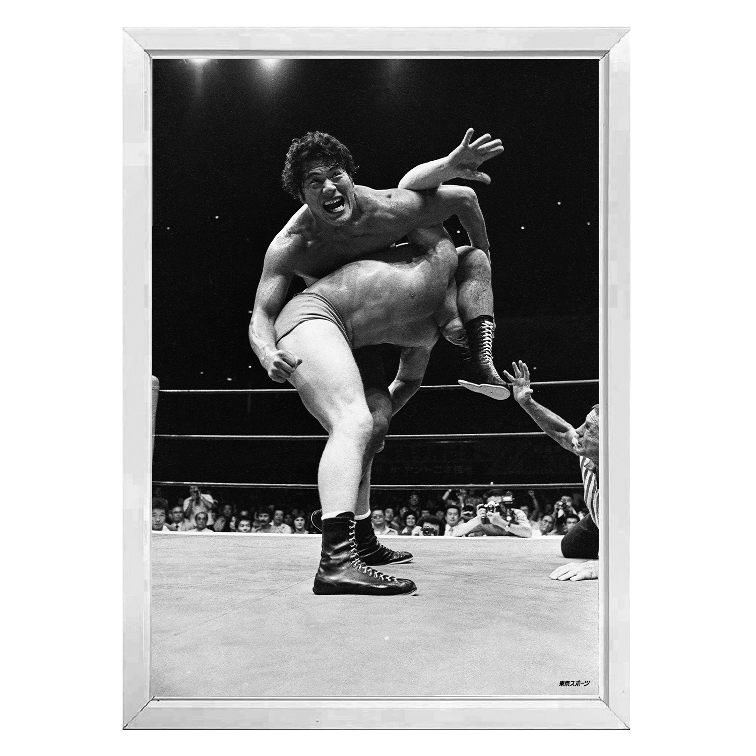 ファイティングポーズのアントニオ猪木氏のパネルとミニリングを背景に、試合の雰囲気を味わえる写真が撮影できる今展限定のフォトスポットを用意。会場内にてグッズをお買い上げの方にご利用いただけます。