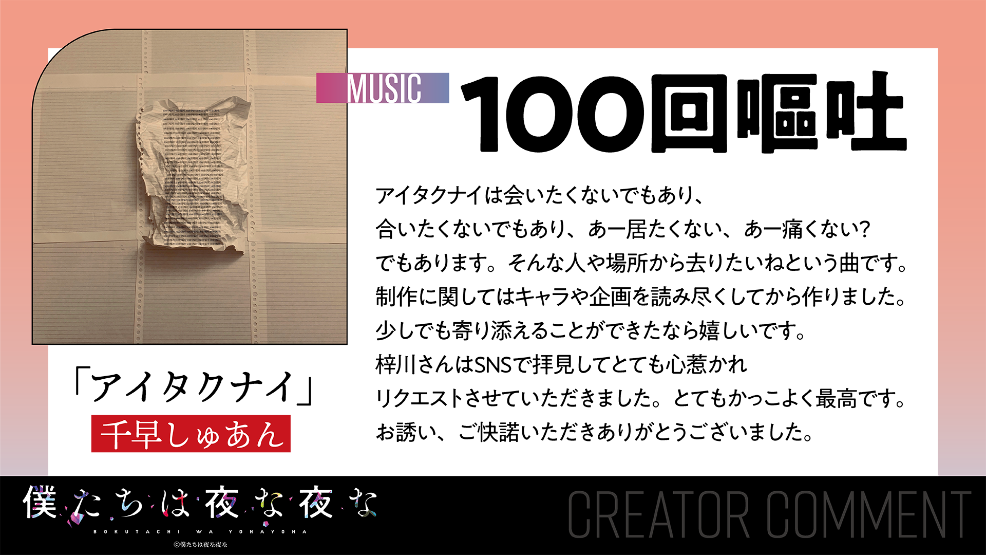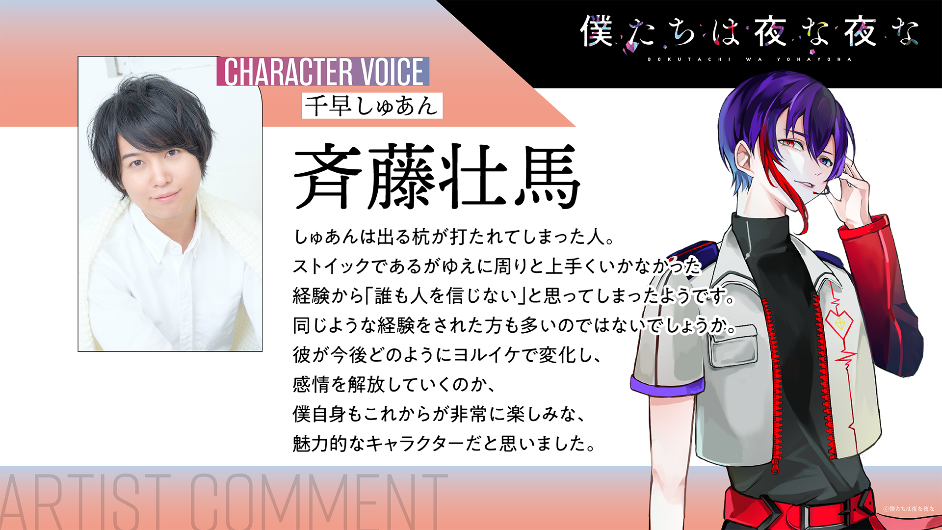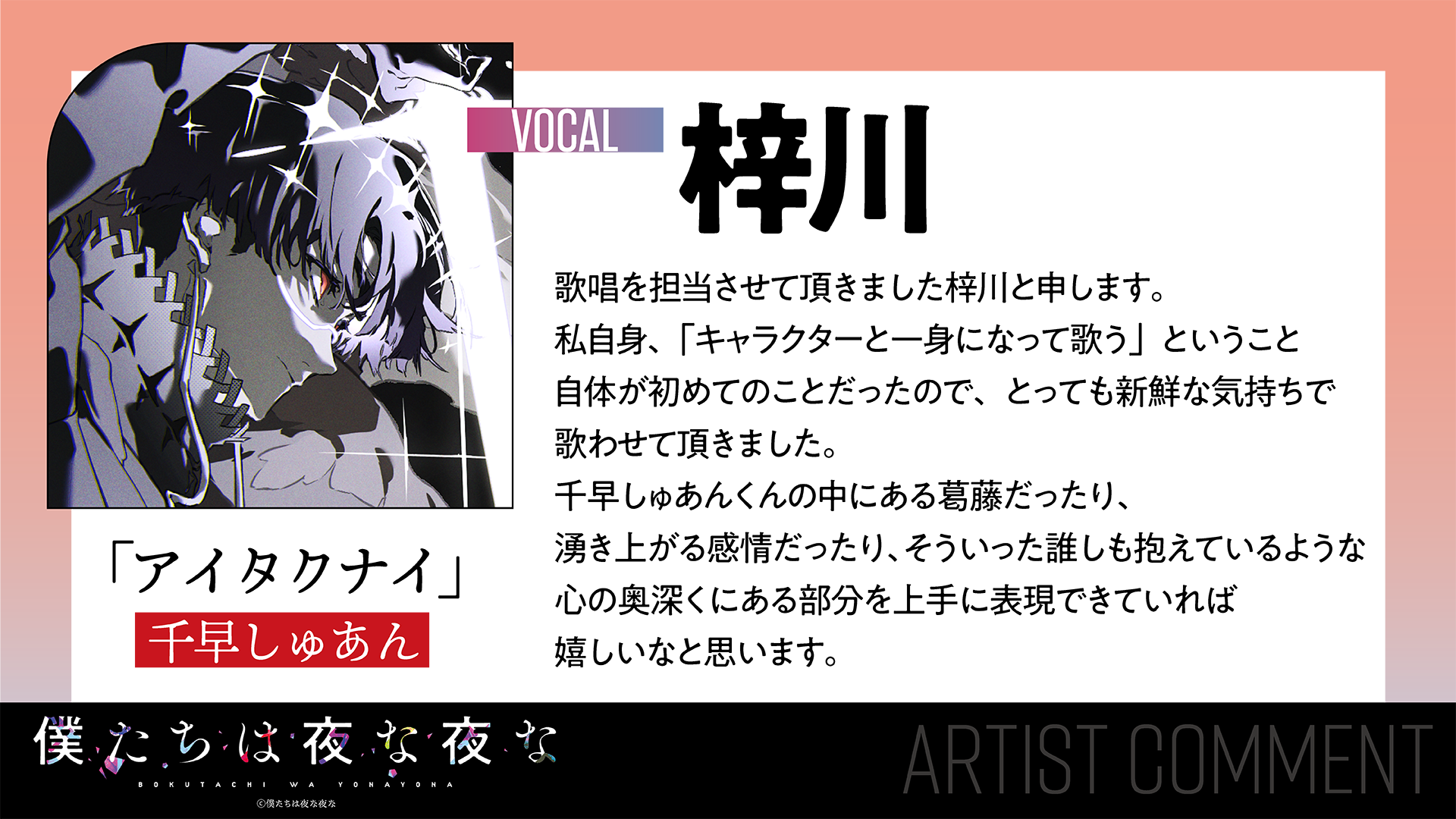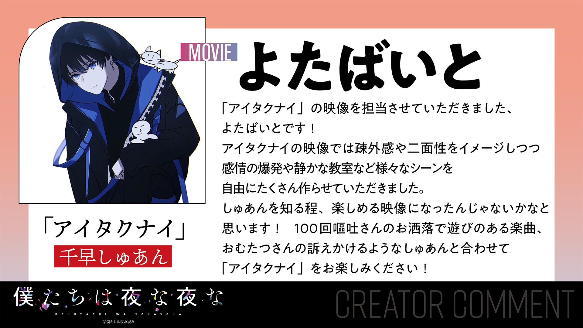 本当の自分を解放する共感性ドラマコンテンツ『僕たちは夜な夜な』(通称『僕よな』)。キャラクターが抱えている「苦悩」を声優ボイス付きショート動画で吐露し、ボカロP×歌い手によって「感情」が歌になる今作!