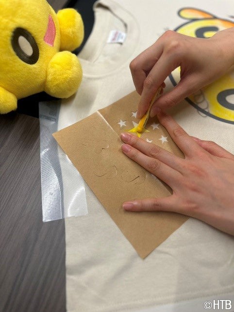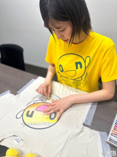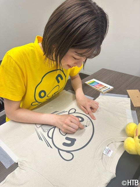デザインは「HTBは皆さんとの距離を縮めたい!」とonちゃんが元気にドーンと飛んでくるイラスト。出演者が着用するのは黄色のTシャツですが、販売するのは日常使いしやすい「ライトベージュ」(大人用)と「白」(子供用)です。