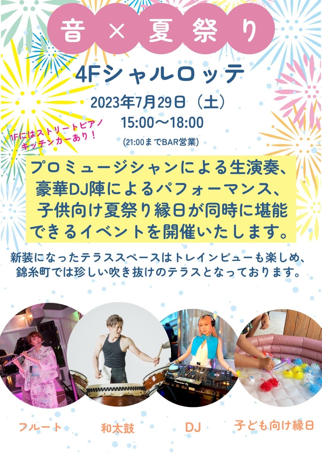 今年は当ホテル4階のレストラン「シャルロッテ」のテラスリニューアルオープンに伴い、隅田川花火大会当日、「音」×「夏祭り」で錦糸町を盛り上げます。新旧あらゆるカルチャーが混在する錦糸町だからこそ実現できる、一夜限りのスペシャルイベントをぜひこの機会にお楽しみください。