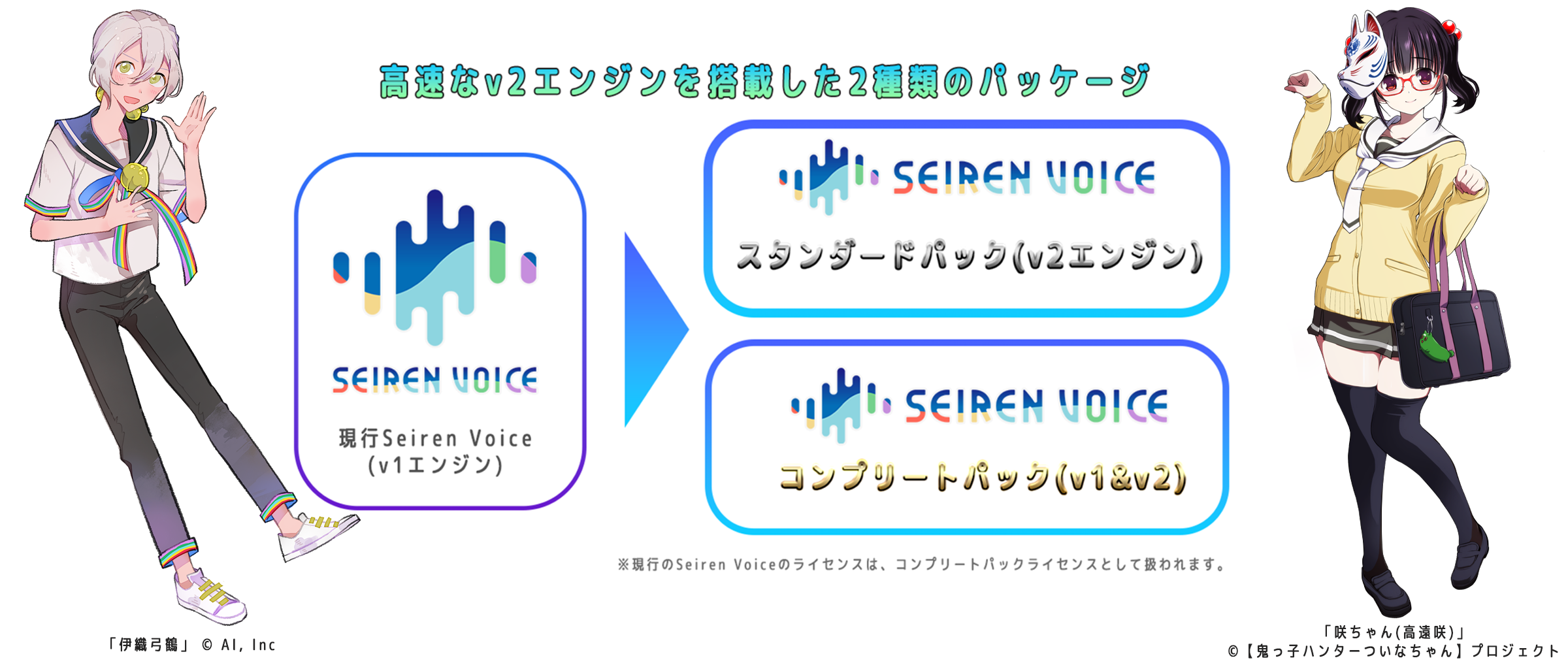今回、提供開始するv2音声ライブラリ対応のSeiren Voiceは、グラフィックボードが搭載されていないローエンドのPCでも利用可能で、声変換の所要時間も現行の音声ライブラリの1/5以下に短縮され、より快適なコンテンツ制作を実現します。各種オンラインストアでは、音声ライブラリv1とv2を両方利用できる「Seiren Voice コンプリートパック (v1&v2)」(価格:17,600円)とv2のみが利用可能な「Seiren Voice スタンダードパック (v2)」(価格:14,300円)の2種類を販売。現行のSeiren Voiceを購入した既存ユーザーのライセンスは、「Seiren Voice コンプリートパック (v1&v2)」のライセンスとして扱われ、v2音声ライブラリが公開され次第、無償で利用できるようになります。