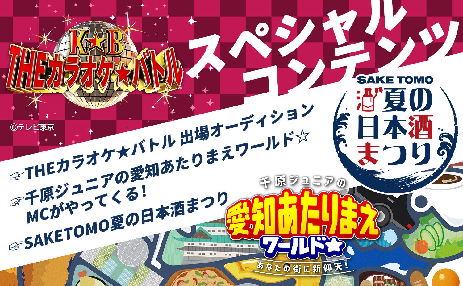 内容:公開収録やスペシャルゲスト&アーティストステージ、縁日屋台、恒例の爆アゲ盆踊り大会など幅広い年齢層の方に楽しんでいただけるコンテンツをラインナップします。愛知の酒蔵の日本酒が楽しめるスペシャルブースや、「THEカラオケ★バトル」の出場権をかけたオーディションなど、初実施のコンテンツも盛りだくさんです!