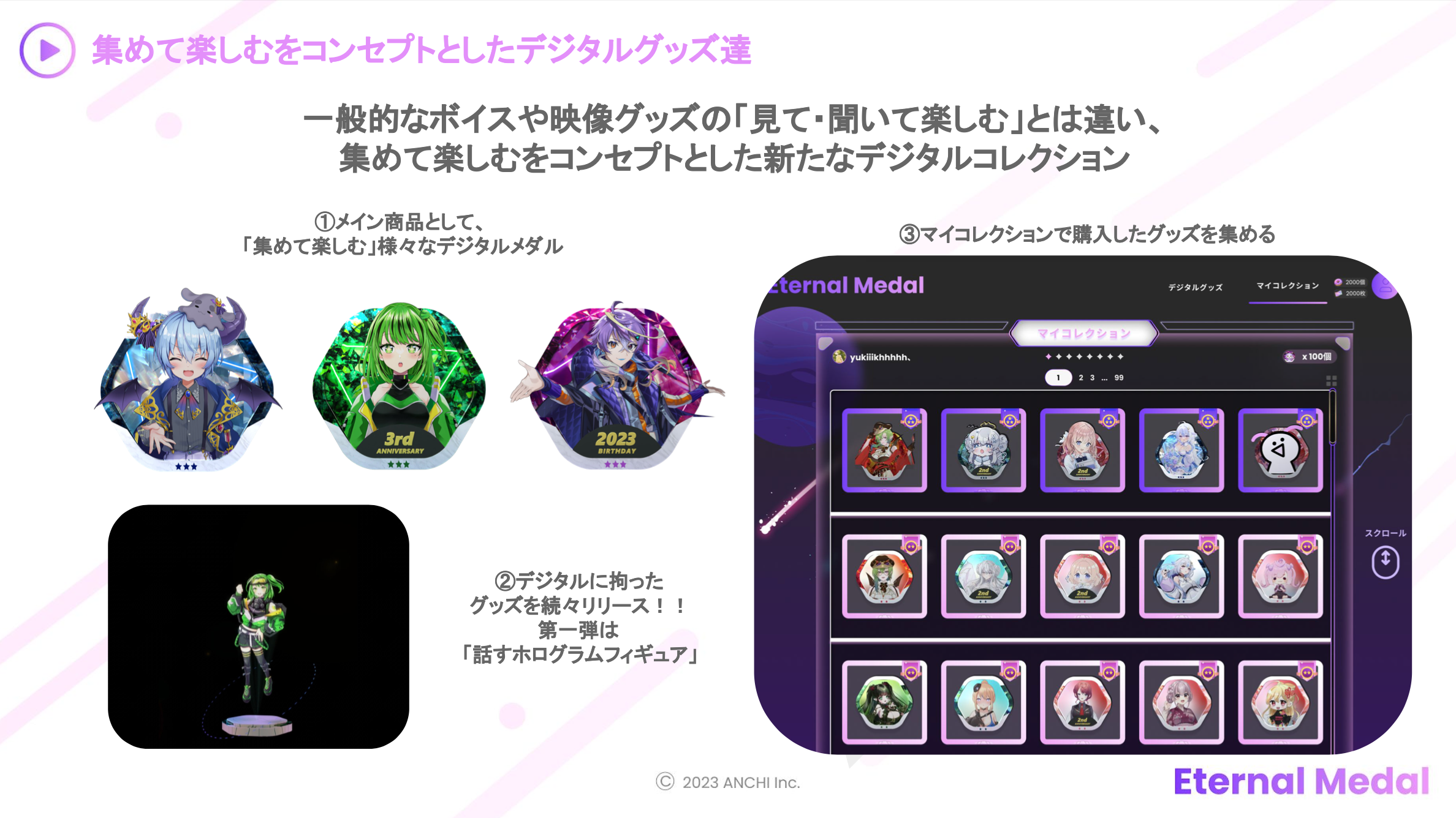 ANCHI株式会社(兵庫県神戸市中央区、代表取締役:中山翔)はバーチャルタレント(Vtuber、VLiver)向けのメダル型のデジタルグッズをガチャで販売することができる「ETERNAL MEDAL」(通称エタメ)のβ版の提供を開始したことをお知らせいたします。