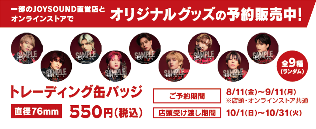 同オリジナルカットデザインの缶バッジ(全9種ランダム)の予約販売も実施します。コラボキャンペーン実施期間中、コラボ実施店舗及びオンラインストア(https://shop.joysound.com/campaign/online_shop/)で予約受付します!