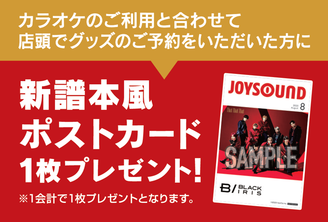 カラオケのご利用と合わせて店頭で缶バッジのご予約をいただいた方全員に、新譜本風ポストカードを1枚プレゼント!