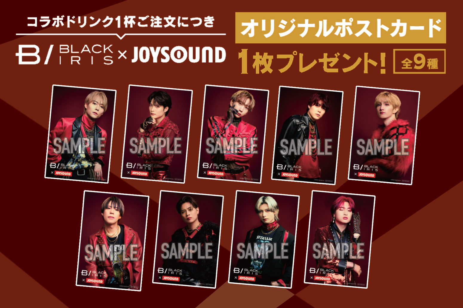 注文特典として、コラボドリンク1品ご注文につき、アーティスト写真のアザーカットを使用したオリジナルソロポストカード(全9種)の中からランダムで1枚プレゼントします。