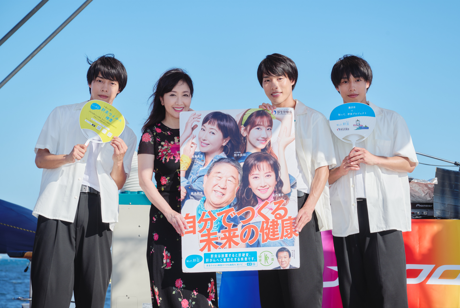 この度7月29日(土)に今年度の積極的広報地域である藤沢市で開催された、「知って、肝炎プロジェクト」×えのぼん 江の島東浜盆踊りフェス特別ステージに、肝炎対策特別大使の伍代夏子氏、インフルエンサーの佐藤三兄弟が出演しました。
