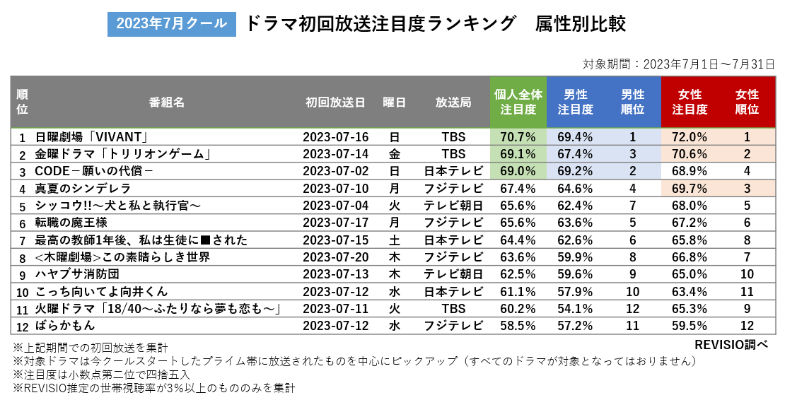 7月からスタートした、夏ドラマで主にプライム帯に放送されているドラマをピックアップ*し、REVISIO独自の注目度という指標によって初回放送の「注目度ランキング」を作成いたしました。その結果、個人全体、男性、女性の1位は同じ番組で、TBSの『日曜劇場「VIVANT」』でした。