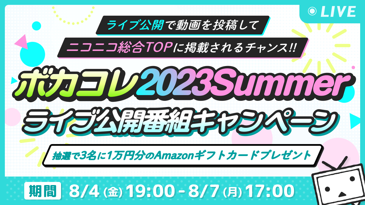 「ボカコレ2023夏」のタグを付け、「ライブ公開」機能※を利用して動画を投稿したクリエイターに、Amazonギフト券1万円分を抽選で3名にプレゼントします。また、これらのライブ公開された動画にコメント投稿した視聴者には、ニコニ広告福引チケットをもれなくプレゼントします。