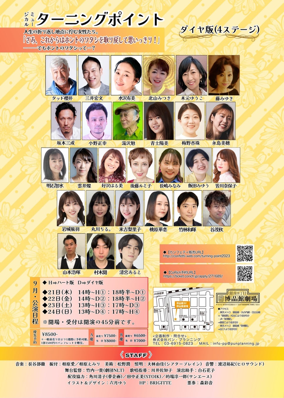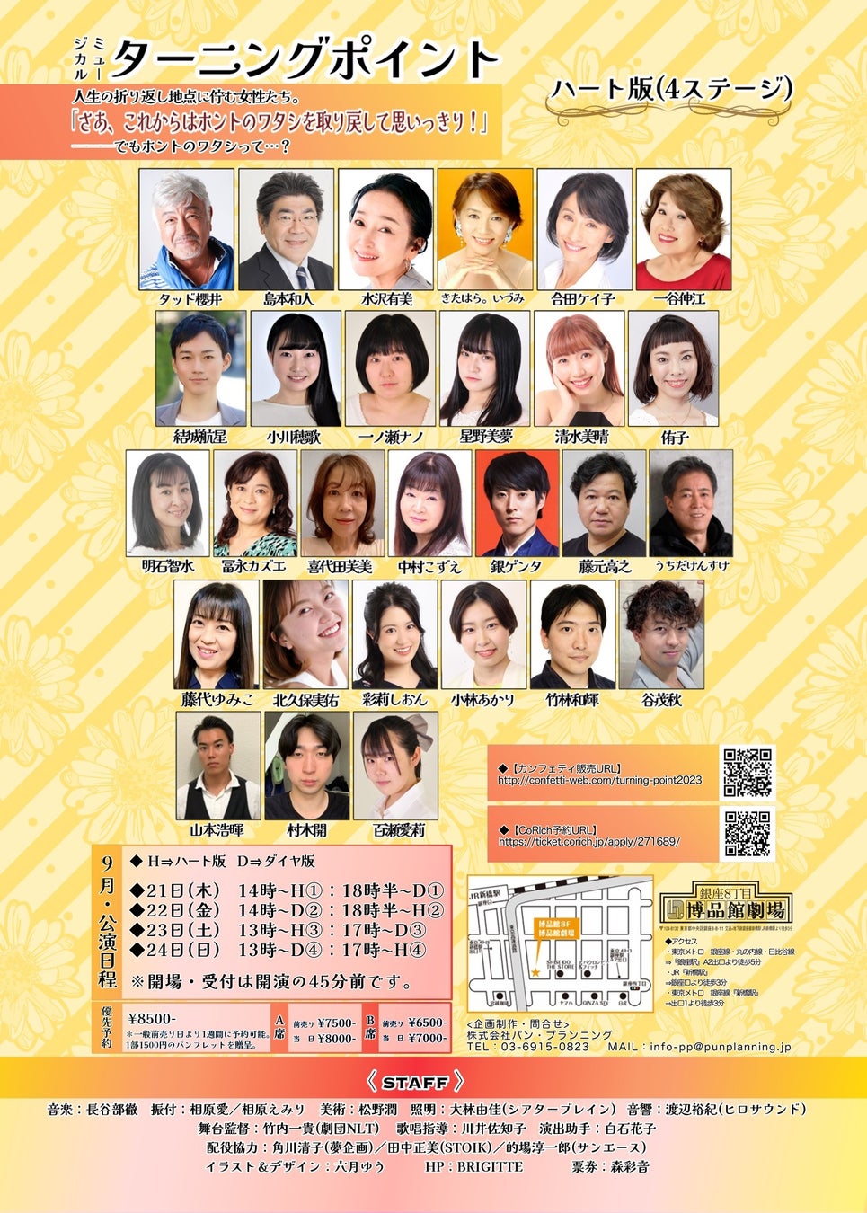 株式会社パン・プランニング主催、『ミュージカル ターニングポイント』が2023年9月21日(木)~9月24日(日)に銀座博品館劇場(東京都中央区銀座8丁目8-11)にて上演されます。