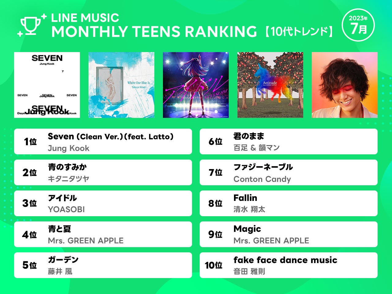 そのほか、4位には夏の定番曲として10代から根強い支持を誇るMrs. GREEN APPLE「青と夏」、「Magic」が9位にランクイン。10位には若年層から注目を集める現役大学生のアーティスト・音田雅則の新曲「fake face dance music」がランクインを果たしました。