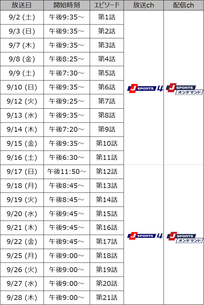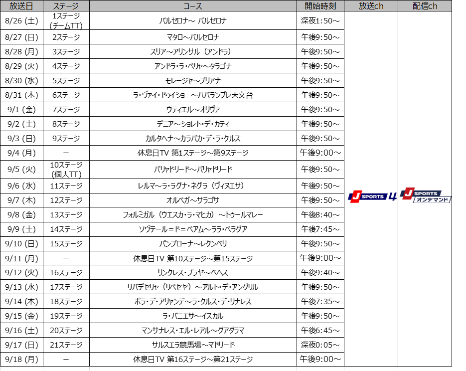 8月26日(土)に開幕するブエルタ・ア・エスパーニャの全21ステージを今年も独占生中継します。さらに、シーズン最後のグランツールの開幕をより多くのサイクルロードレースファンにお届けするため第1ステージの模様をJ:COM及び一部のケーブルテレビ局、スカパー!にて無料放送、J SPORTSオンデマンドで会員無料LIVE配信を行います。また翌日の第2ステージはJ SPORTSサイクルロードレース公式YouTubeチャンネルで無料LIVE配信します。