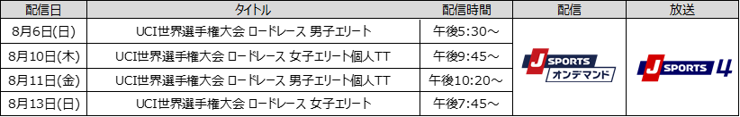 『UCI自転車世界選手権大会(イギリス・グラスゴー大会)』の男女エリート ロードレースと個人タイムトライアルを生中継します。今年の世界選手権は、13種目の自転車競技が同じ場所、同じ期間で開催される史上初の大会となります。男女エリート ロードレース日本代表は、新城 幸也選手と與那嶺 恵理選手。各国から、世界チャンピオンのレムコ・エヴェネプール選手他、ワウト・ファンアールト選手、ヤスペル・フィリップセン選手、マチュー・ファンデルプール選手などの注目選手たちが、世界王者の証であるマイヨ・アルカンシェルを巡って出場します。世界ナンバーワン決定戦をお楽しみください。