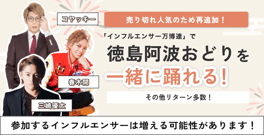 本クラウドファンディングと並行して、阿波おどりを応援したいというインフルエンサーと連携し、「インフルエンサー万博 in 徳島阿波おどり」が開催されます。インフルエンサー万博は、企業の商品やご当地の商品などを複数のインフルエンサーが実際に触れ紹介する展示会で、これまでは東京などの都心を中心に開催していましたが、今回地方を盛り上げたいという代表やインフルエンサーの想いから、阿波おどりの開催と合わせて徳島市で開催されます。現在、宮迫博之さんの出演が決定しており、8月の開催にかけて続々と参加インフルエンサーが発表されます。開催場所については、ご支援頂いた企業様へ直接ご案内致します。