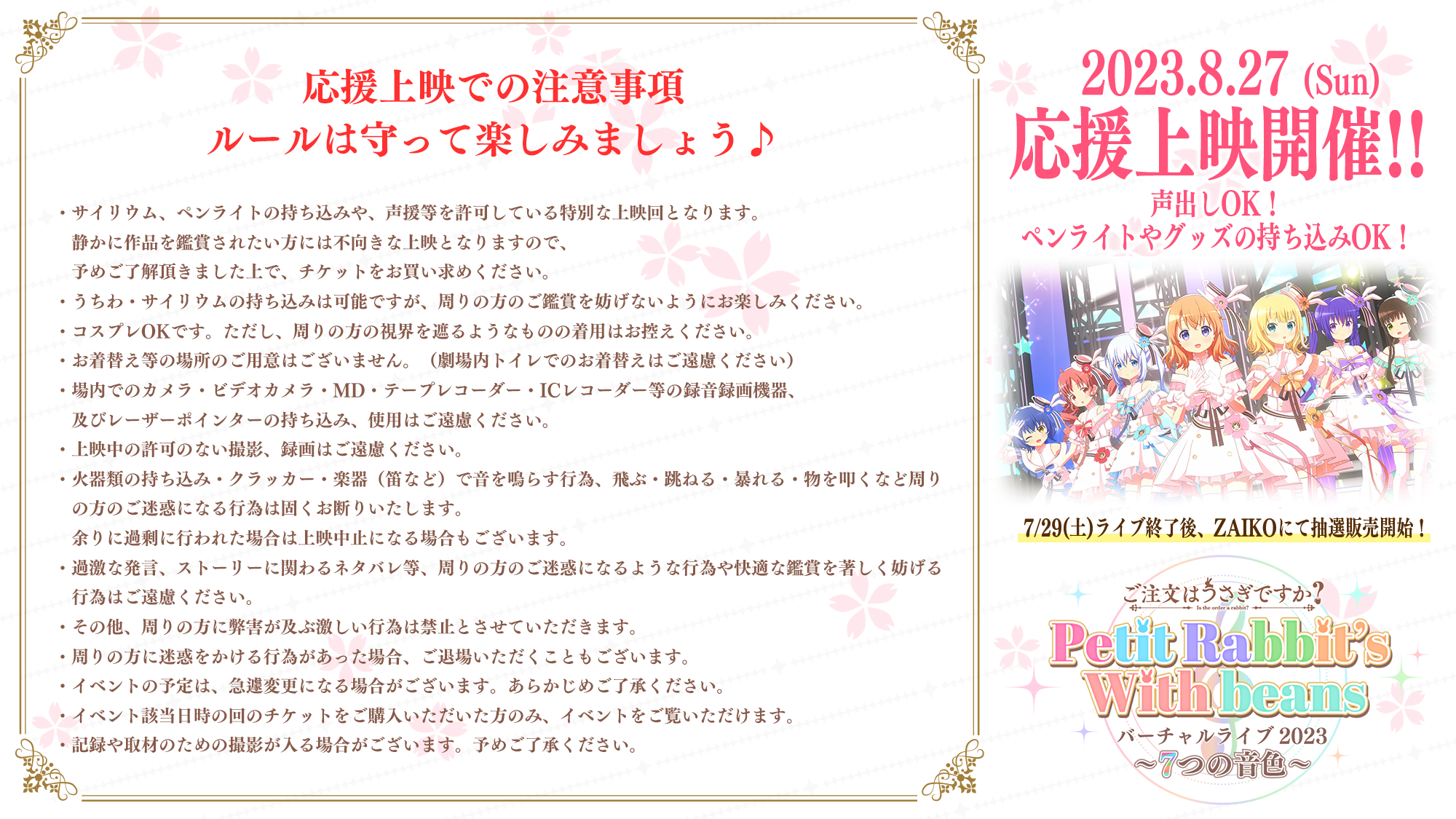本イベントは、7月29日(土)にZAIKOにて配信された『ご注文はうさぎですか?Petit Rabbit’s with beans バーチャルライブ2023 ~7つの音色~』の劇場応援上映で、TOHOシネマズ上野にて2023年8月27日(日)に開催いたします。