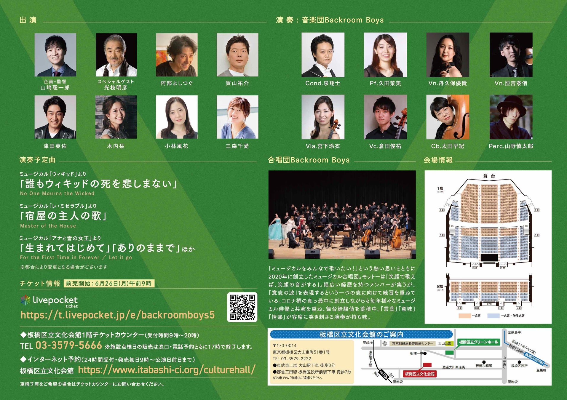 本演奏会は Art&Arts が運営するセミプロフェッショナル合唱団「BackroomBoys」の本公演として開催する、バックコーラス付きミュージカルナンバーばかりを取り上げる大迫力の演奏会です。今年は公益財団法人板橋区文化・国際交流財団との共催にて開催いたします。