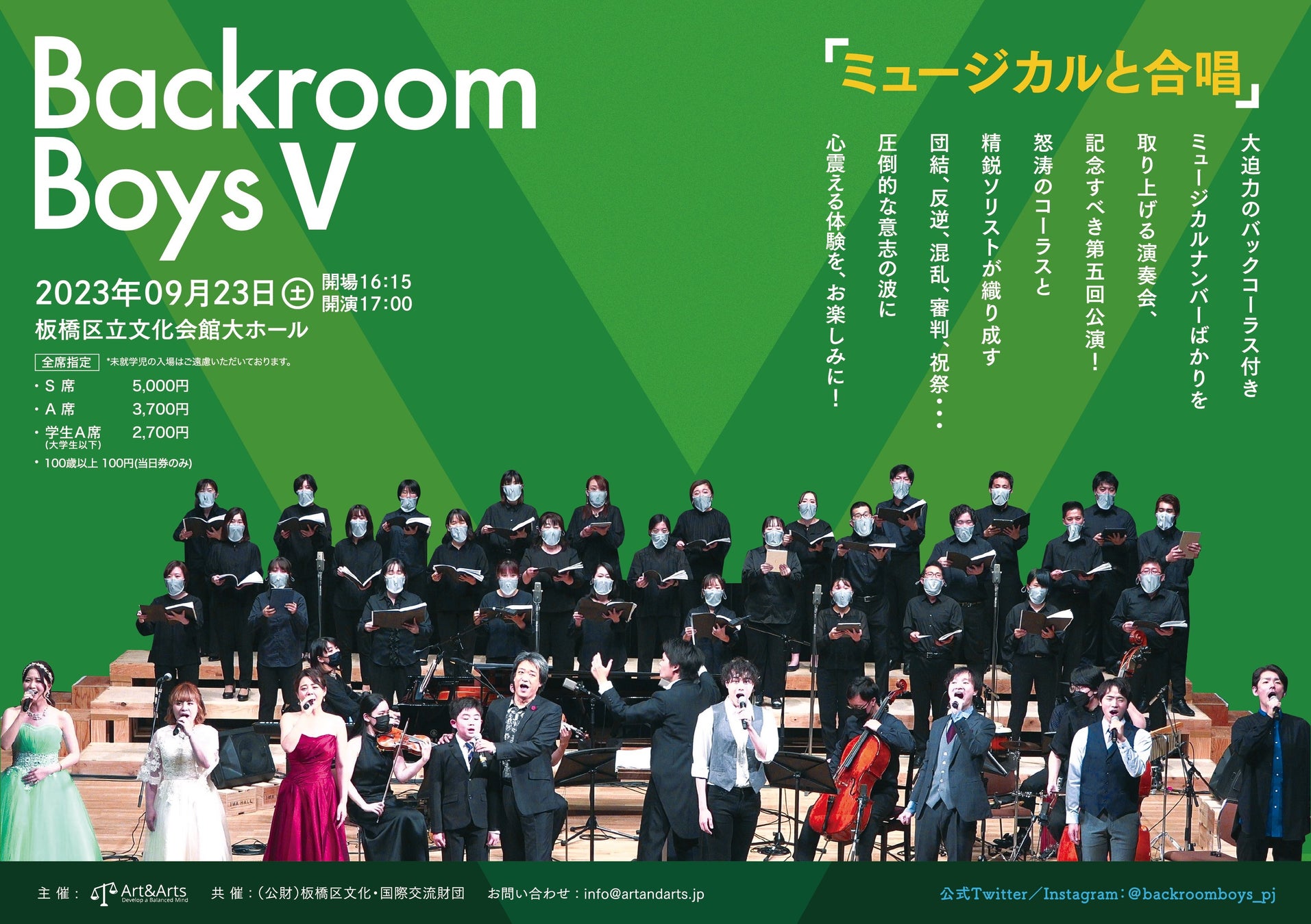 合同会社Art&Artsは2023年9月23日、コーラス付きミュージカルナンバーばかりを取り上げる演奏会「BackroomBoysⅤ~ミュージカルと合唱~」を板橋区立文化会館にて開催します。