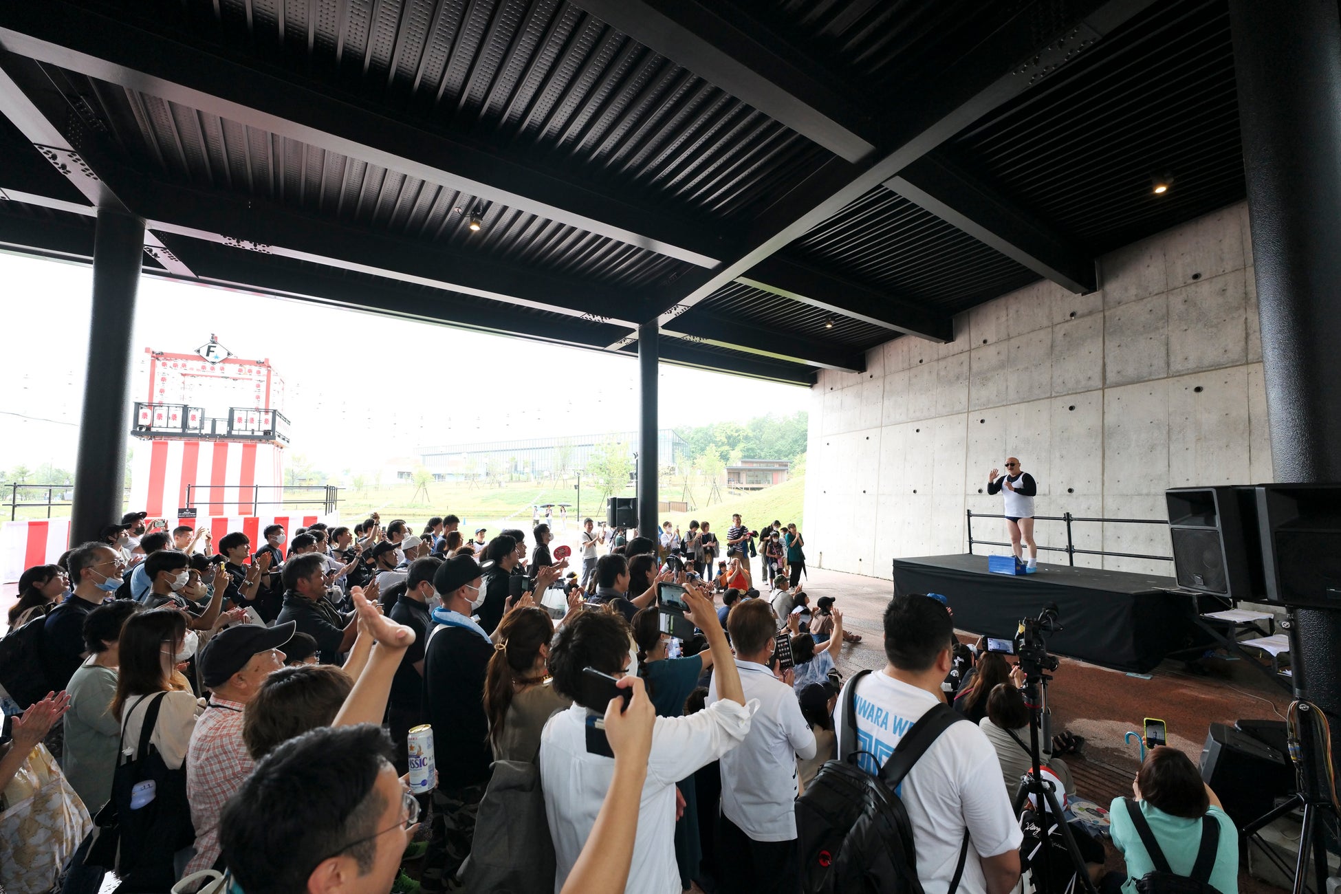 そしてトニーこと、TONIKAKU(とにかく明るい安村)が登場する頃には橋の幅で収まらないくらいの観客が集まり、橋の上から手を振る子どもたちの姿も。その数は全500人を超えていたことでしょう。世界のお笑いファンを魅了した「アイムウェアリング!」「パーンツ!」はここでも大人気。子どもからのポージングリクエストにも応える地元北海道出身スターの凱旋ステージとなりました。