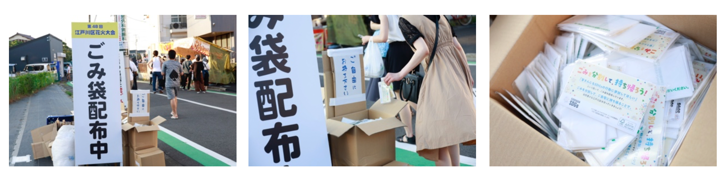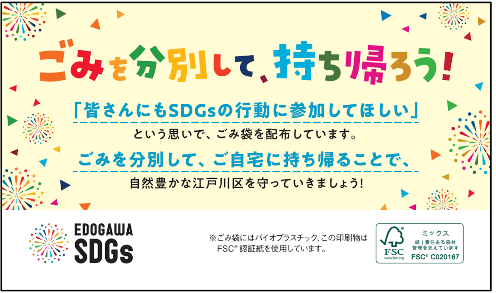 山崎怜奈が番組内で伝えた、ごみ袋施策。今回、来場者参加型の、初めてのSDGs施策として、花火大会会場内(協賛席受付)および小岩方面(片山こぶしひろば)、篠崎方面(上篠崎2丁目6番付近)3箇所にてオリジナルごみ袋を配布しました。ごみ袋にはバイオプラスチック、同封するチラシにはFSC認証紙を使用。思い出は心に、ごみは袋に。来場者と一体となって、自然豊かな江戸川区の環境を守ります。