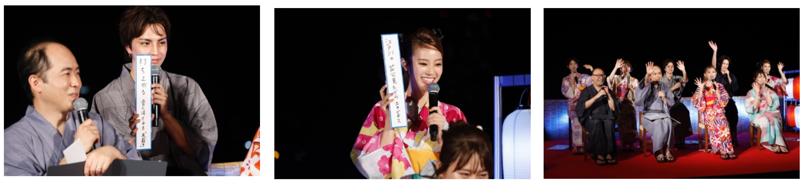 EDOGAWA SENRYUコーナーでは、出演者が江戸川花火大会の感想を川柳に込めました。山崎怜奈は、『虹色に 彩る花火 江戸川区』と詠み、斉藤猛区長が「江戸川区に住んでいる鍵屋さんが打ち上げてくれる圧巻の花火。鮮やかな色も見てほしい。」とコメントしたことにかけ、江戸川花火の素晴らしさを伝えました。そして、前コーナーで女性陣から絶賛されたバンダリ亜砂也は『打ち上がる 音に消された 「君が好き」』と詠み、「まるで夏のドラマ!」と、再び女性陣から称賛の声が。そして、江戸川区には“青春できる場所”がたくさんあると話した中町綾は『江戸川の 花火見たから 土手でキス』と詠み、自身の体験談を元にした淡い川柳を披露。初めて江戸川花火見たというゆうちゃみは『来年も 江戸川花火 楽しみデス♩』と詠み、「本当に感動した。来年も絶対来たいと思います。」と、夏の風物詩を締め括りました。