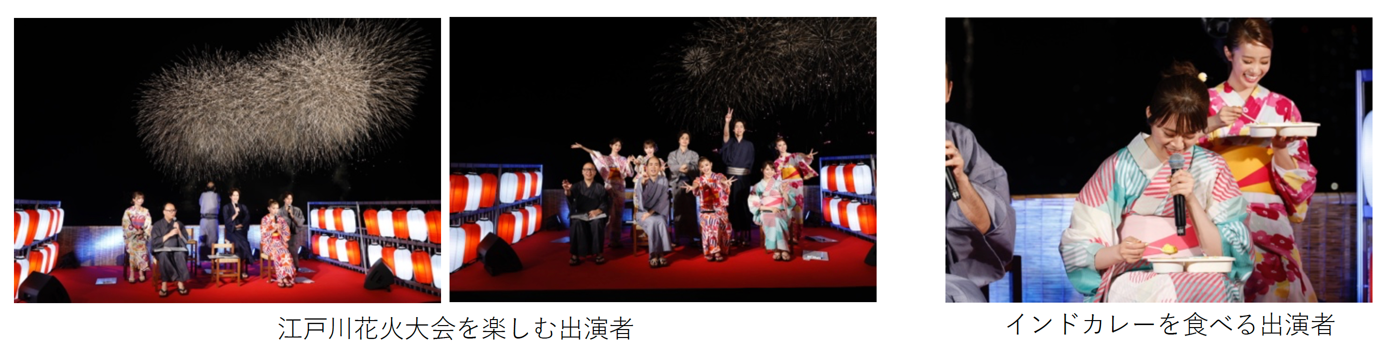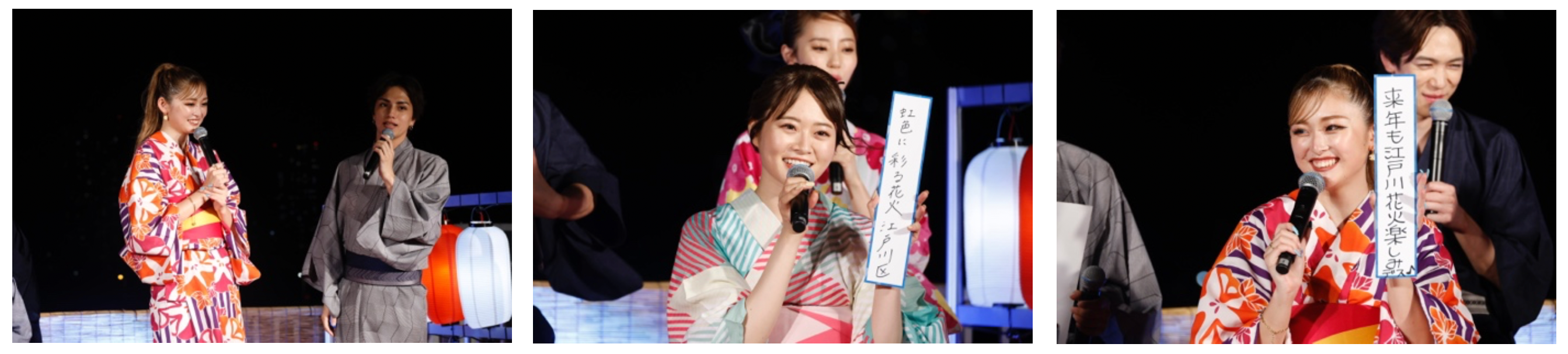 4年ぶりの開催において、江戸川区出身の中町綾は「区民はずっとずっとずっと待ってました!本当に嬉しい。開催していただき、本当にありがとうという気持ちです。」と感慨深く話すと、小室安未も「昔は自転車をこいで見に行ってました。地元のビッグイベントに参加させてもらって光栄。」と喜びを伝えました。江戸川区の未来カンファレンスの委員も務めていた山崎怜奈は、「江戸川区は自然が豊かで水も大切にしている。今回は、(初めての試みとして)花火大会の来場者へごみ袋を配布したんです。地域を守るために、ごみ箱を探すのではなく、持ち帰ってねという活動。区民みんなでSDGsに取り組んでいるんです。」と、区をあげてSDGsに取り組んでいる現状を伝えました。途中、オンライン中継で出演した斉藤猛区長は、「人情味あふれるみんなが住みやすい街をつくっていきたい。」と話し、住みやすい街づくりのひとつとして、「海外の方へも住みやすい街に」と斉藤猛区長。江戸川区は、全国の自治体の中で10番目に外国人居住者が多く、中でも日本に住んでるインド人の7人に1人が江戸川区に住んでいます。それにちなんで、インドカレーを出演者に振る舞う場面も見られました。江戸川区について中町綾は「若くして子供を産んだ友達が多い。公園がとても多いことも魅力で、シングルマザーにも優しいです。」と語ると、小室安未は「子育て支援がいいと聞きます。私の周りもみんな、江戸川区に戻って子育てしてます。」と魅力を語りました。