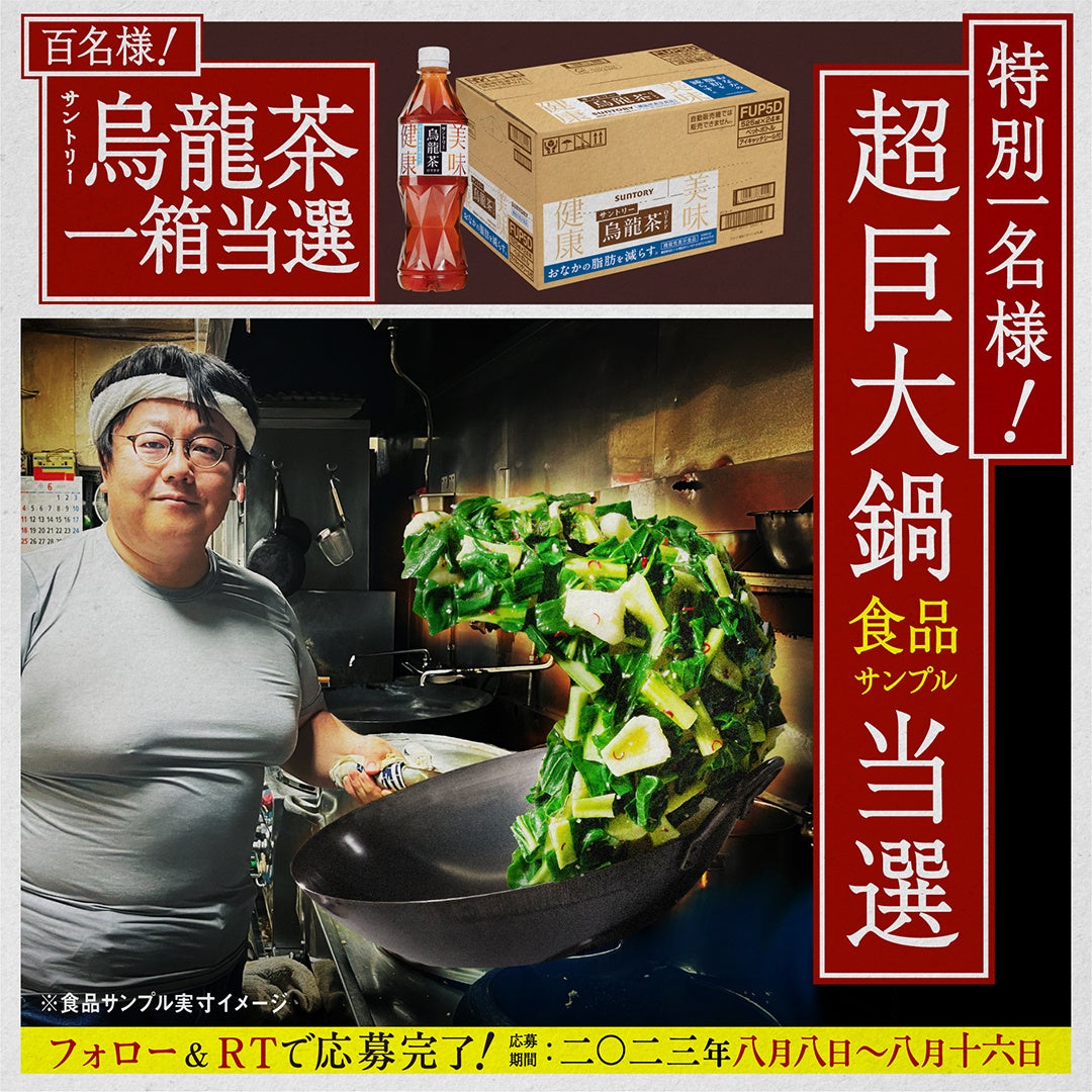新WEB CM「サントリー烏龍茶【おなかの脂肪を減らす】ガチ中華クリエイターCM」の公開を記念して、サントリー烏龍茶の公式Twitterアカウント(@suntory_oolong)をフォローし、キャンペーン投稿をリツイートすると、烏龍茶1ケースと「超巨大鍋 食品サンプル」が当たる、「#ガチ中華クリエイターCM」キャンペーンを実施します。