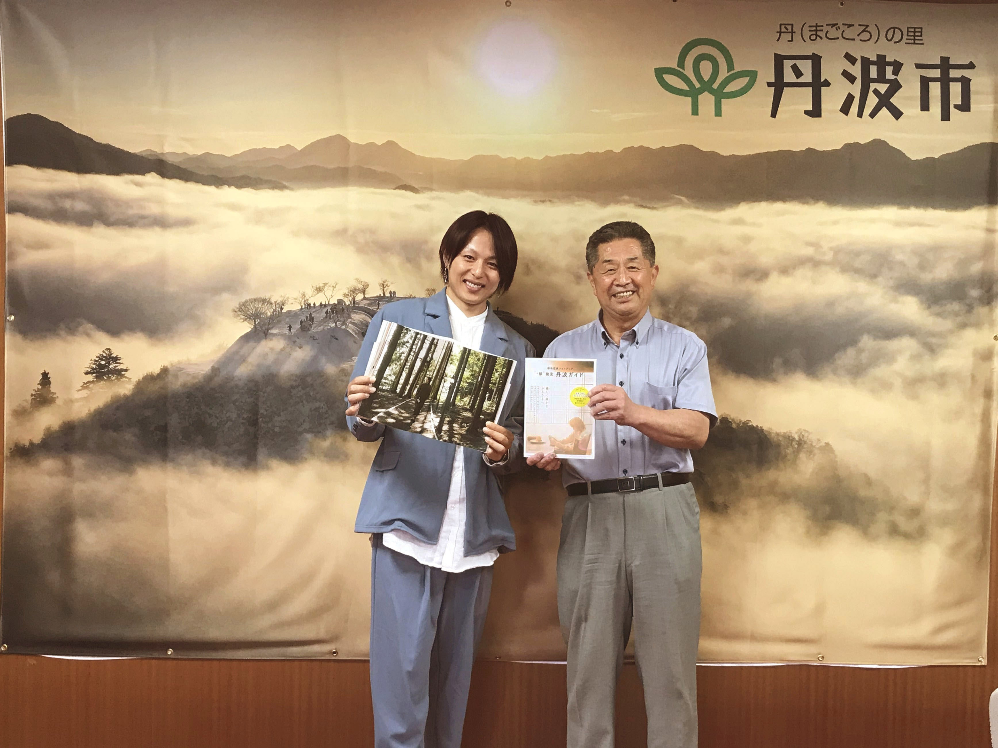 この日、新木の市長表敬訪問を取材しようと、地元の新聞記者が多数来庁。市長の計らいで記者からも新木に次々と質問が寄せられ、予定時間を越えて続いた和やかな会談。これから訪れる人たちに「どんな丹波を感じてほしいか?」という質問では、「四季がはっきりしていて、一年中すてきなところ。来たシーズンによって楽しみ方がちがって、そのつど見られる景色が変わります」と丹波の魅力を流ちょうにアピール。観光課長からも「100点満点の答えです!」と絶賛された。