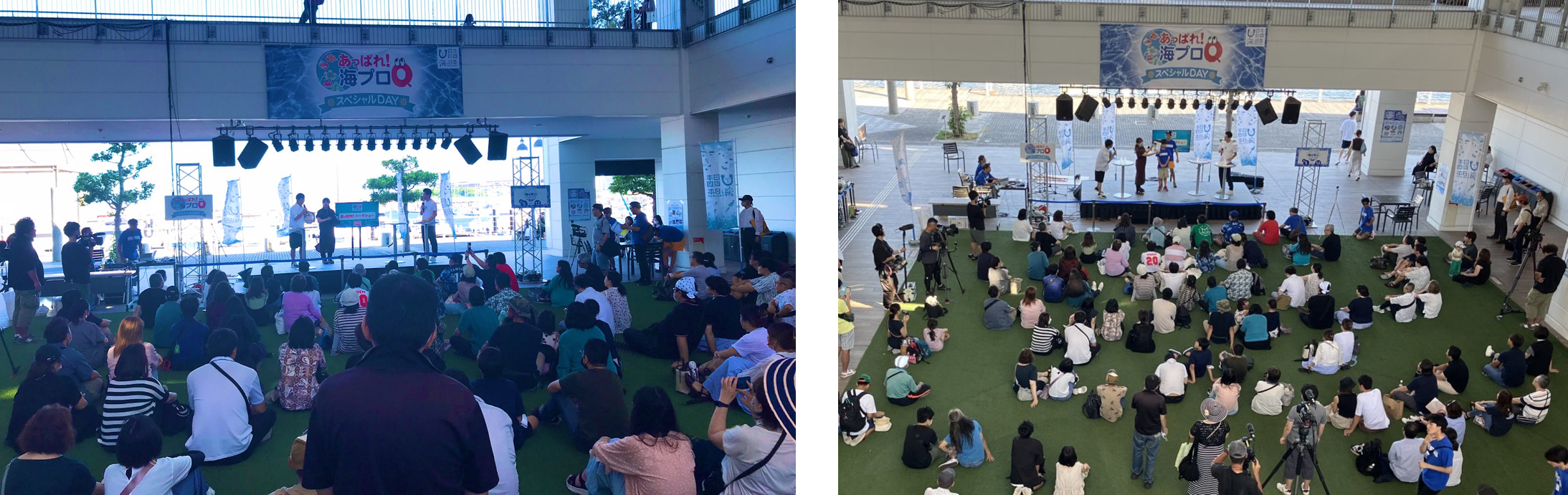 「海を学ぼう」では、番組「あっぱれ!KANAGAWA大行進」から大橋彰と照井七瀬tvkアナウンサー、クイズコーナー「あっぱれ!海プロQ」に出演中の海プロキッズ2名と日本財団 海野光行常務が登壇。かながわの海を知るトークショーを開催しました。キッズから出題されたクイズを鳥羽口に相模湾の深海から会場のお隣、野島(金沢区)の漁業の変遷まで興味の尽きない話題で会場は盛り上がりました。