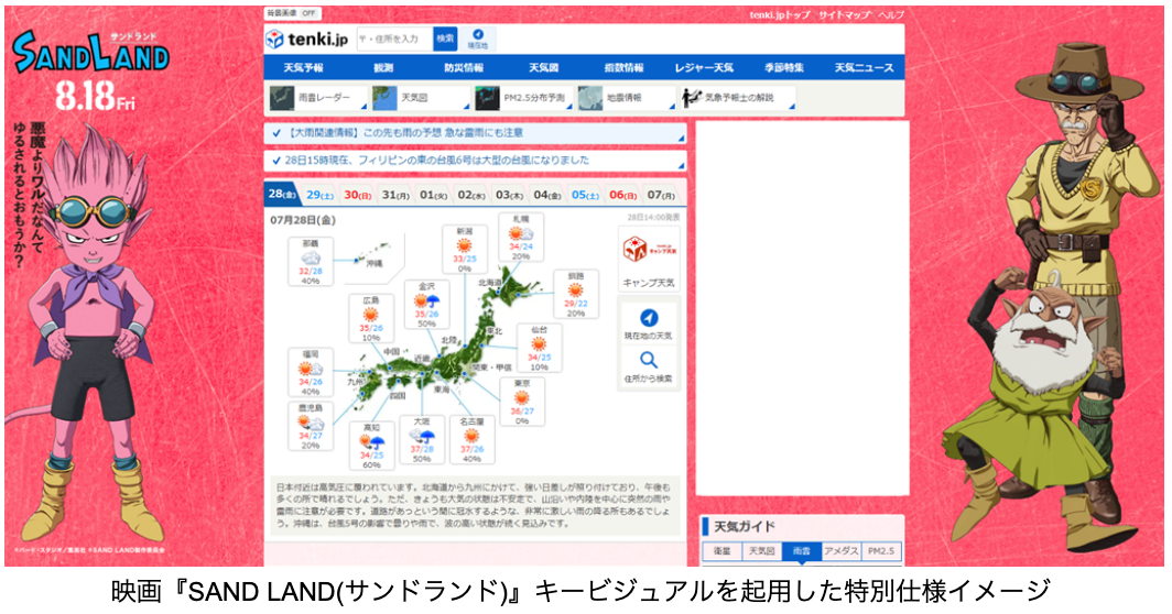 初解禁の版権イラストを使用したタイアップ記事や「tenki.jp」オリジナル録り下し映像の公開をするほか、「tenki.jp」のトップページを映画『SAND LAND(サンドランド)』のキービジュアルを起用した特別仕様でお届けします。