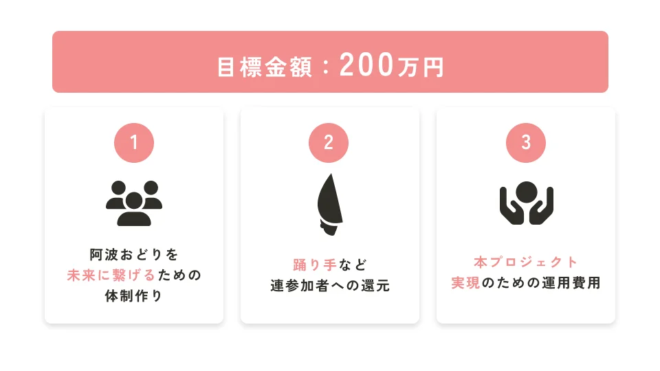 今回、ご支援いただいた金額は、①阿波おどりの一口祭主の企画開発、②予想外の事態にも耐えられる運営体制づくり、③連参加者などの関係者への還元、に使用させていただきます。