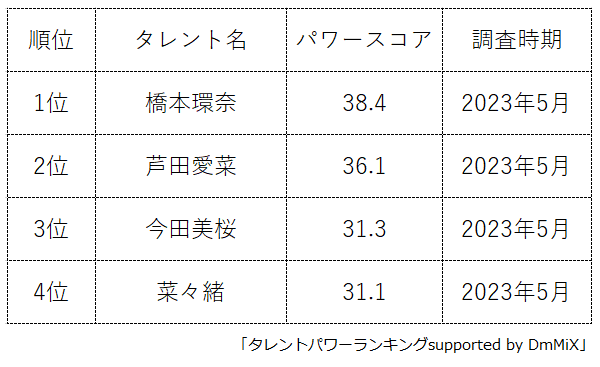 本ランキングは、2023年5月度に実施したタレント調査データ(一部過去実施データ)を利用し、タイトルに応じてランキング形式でまとめたものです。