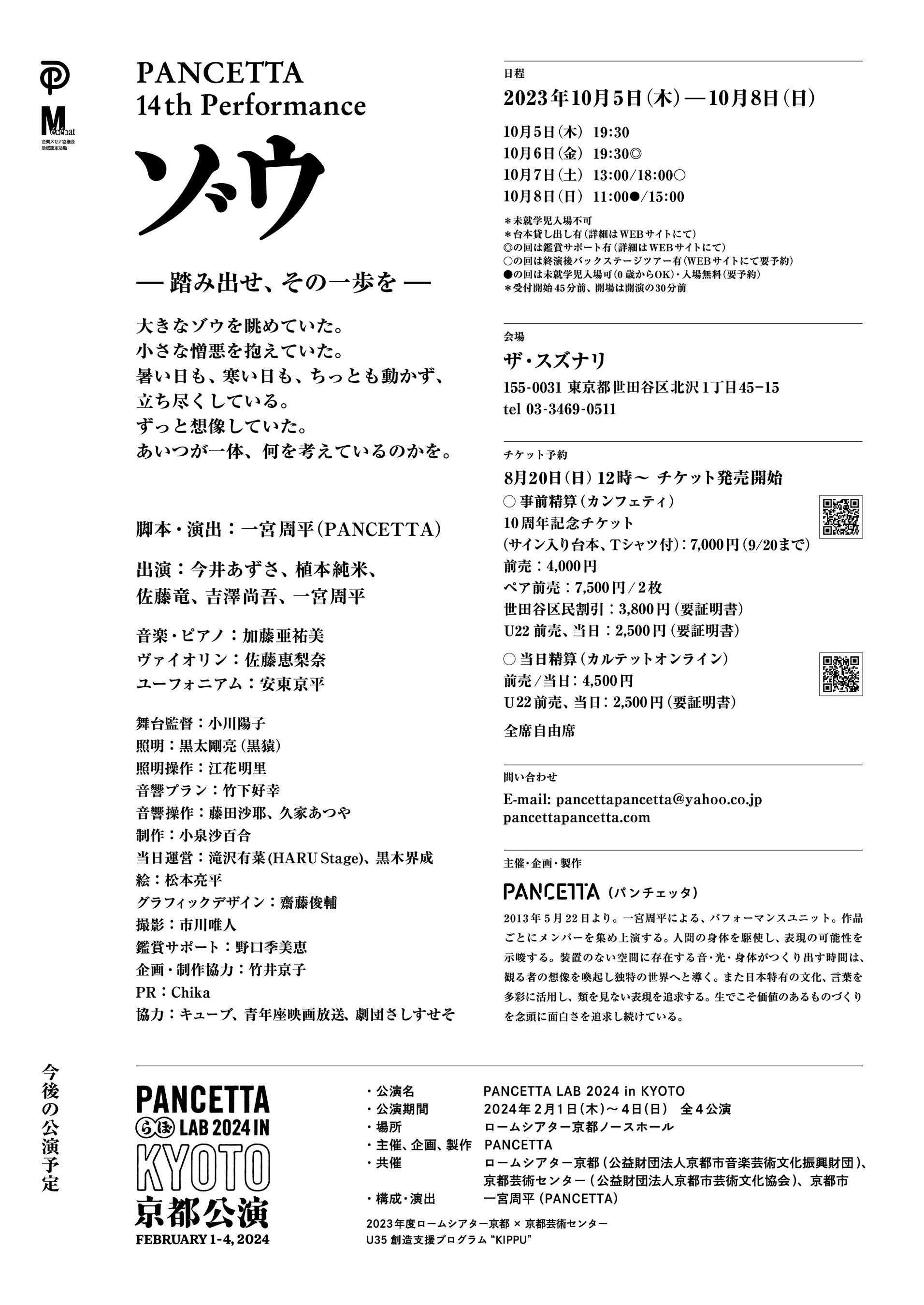 今年、PANCETTA設立10周年を迎えました。さらなる10年が素晴らしいものとなるよう、ザ・スズナリにて新作を披露いたします。PANCETTAの常連とも言える佐藤竜に加え、植本純米、今井あずさ、吉澤尚吾という新たな個性的で魅力的な出演者を迎え、『ゾウ』をテーマに、存分に動き回っていただく予定です。また、生演奏も前回から引き続き、ピアノ加藤亜祐美、ヴァイオリン佐藤恵梨奈、そして初登場ユーフォニアム安東京平を迎え、”ゾウ”の世界をより一層盛り上げてくれることでしょう。