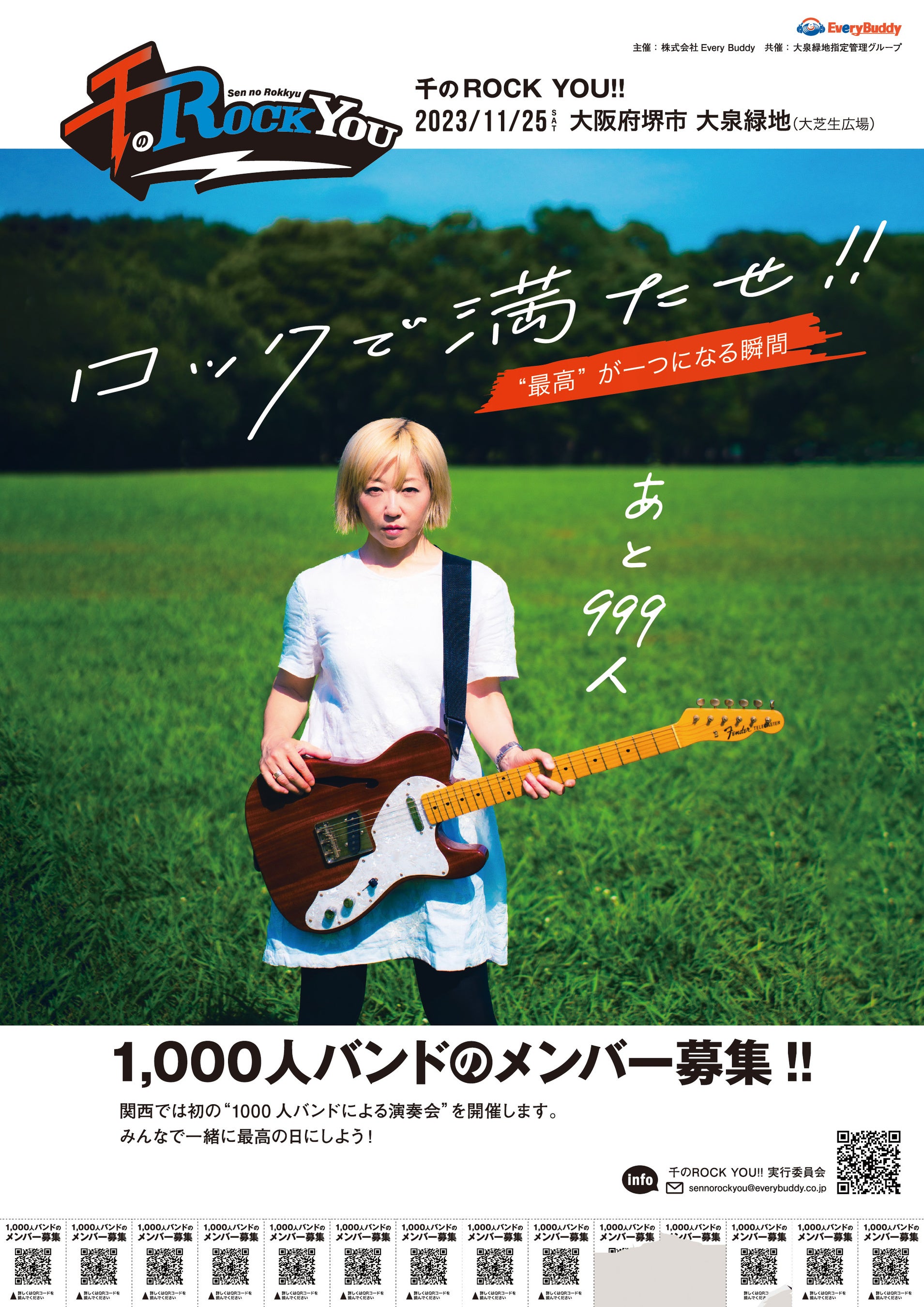 千のROCK YOU!! は、関西では初(当社調べ)の1000人編成のバンドとして同じ楽曲をライブ演奏するためにバンドメンバーを募集し、本番当日にみんなで 一斉に ”せーの“ でライブ演奏するイベントです。