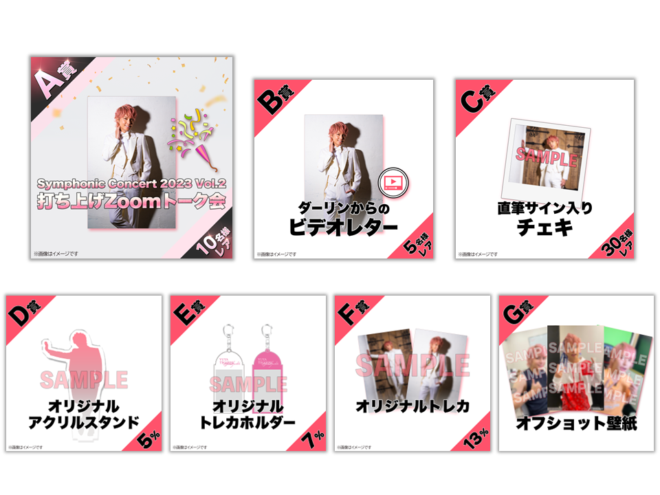 このくじは、株式会社Tixplusが提供しているサービス『くじプラ』を活用し、『Symphonic Concert 2023 Vol.2打ち上げZoomトーク会』や『ダーリンからのビデオレター』など豪華賞品をご用意しております。