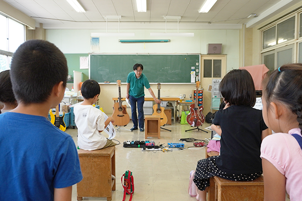 後半は、ギターやエフェクター、アンプなど近くで観察。実際に弦に触れたり、スイッチを押したり回したりして構造を確認した後、子どもたち一人ひとり順番にギターを演奏。最後は、安達によるジャズギターの演奏を全員で鑑賞しました。
