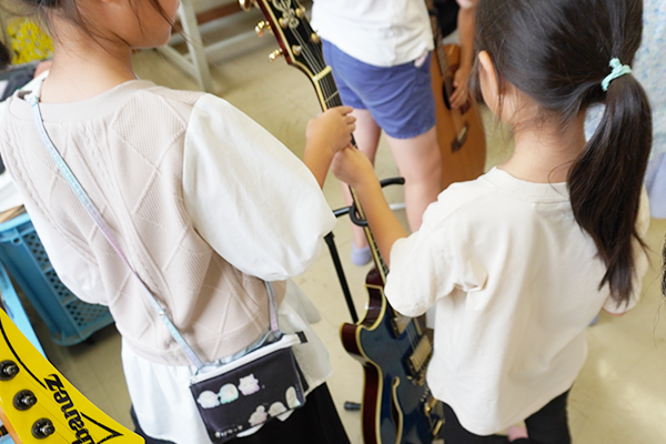 エレキギター、アコースティックギターなど様々なギターと、ギターアンプ、エフェクターを用意して、ギターの仕組みや音色を実際にギターに触れて体験しようという内容で、先月蒔田小学校放課後キッズクラブでの開催に続き2回目の開催です。
