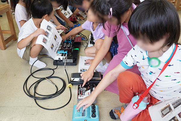 また、ギターアンプやエフェクターなど、スイッチやつまみがある機械には興味津々で、安達が思いもよらない設定に代わっていたりと、子どもたちの順応性の高さに驚かされました。