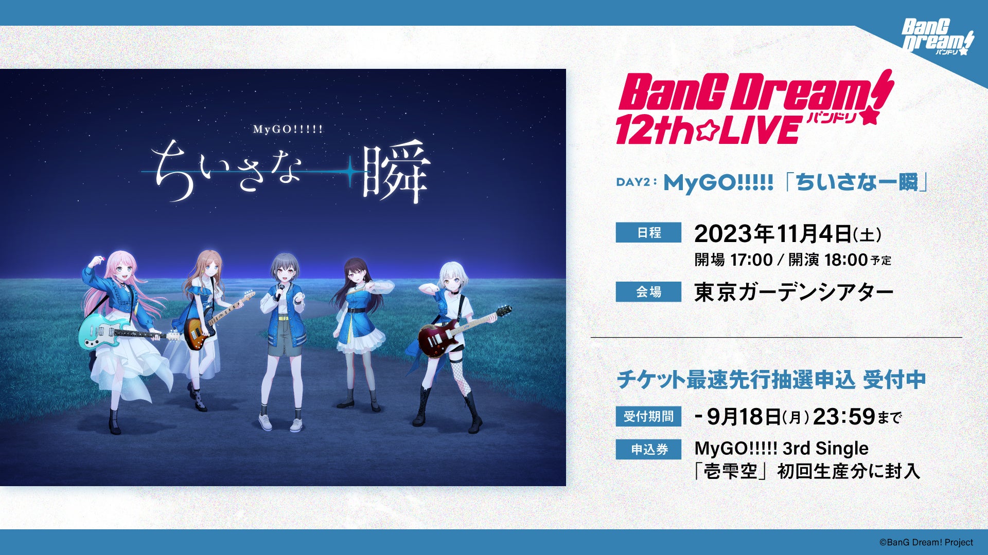 2023年11月4日(土)に、「BanG Dream! 12th☆LIVE」3DAYS公演の2日目として開催予定の「DAY2 : MyGO!!!!!」について、ライブタイトル「ちいさな一瞬」を公開しました。また、ライブのキービジュアルイラストも初公開となりました。