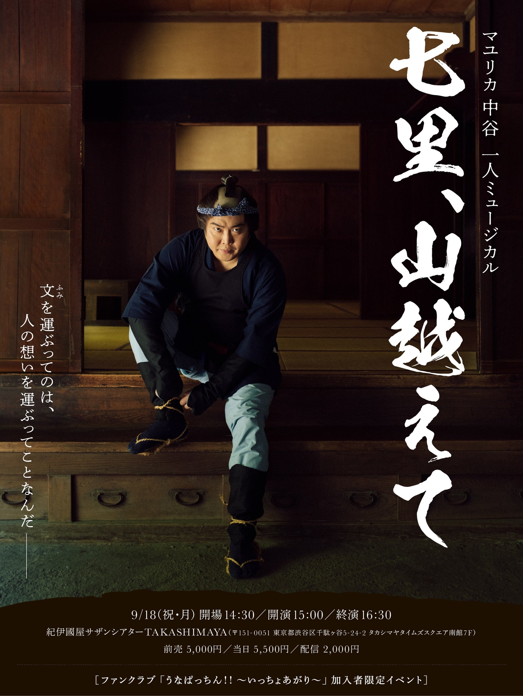 この度、吉本興業所属お笑いコンビ「マユリカ」の中谷が9月18日(祝・月)に、紀伊國屋サザンシアターにて一人ミュージカル「七里、山越えて」を開催することとなりました。